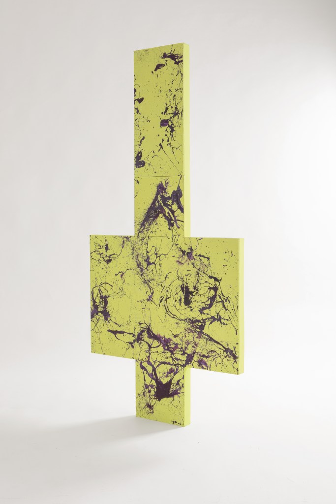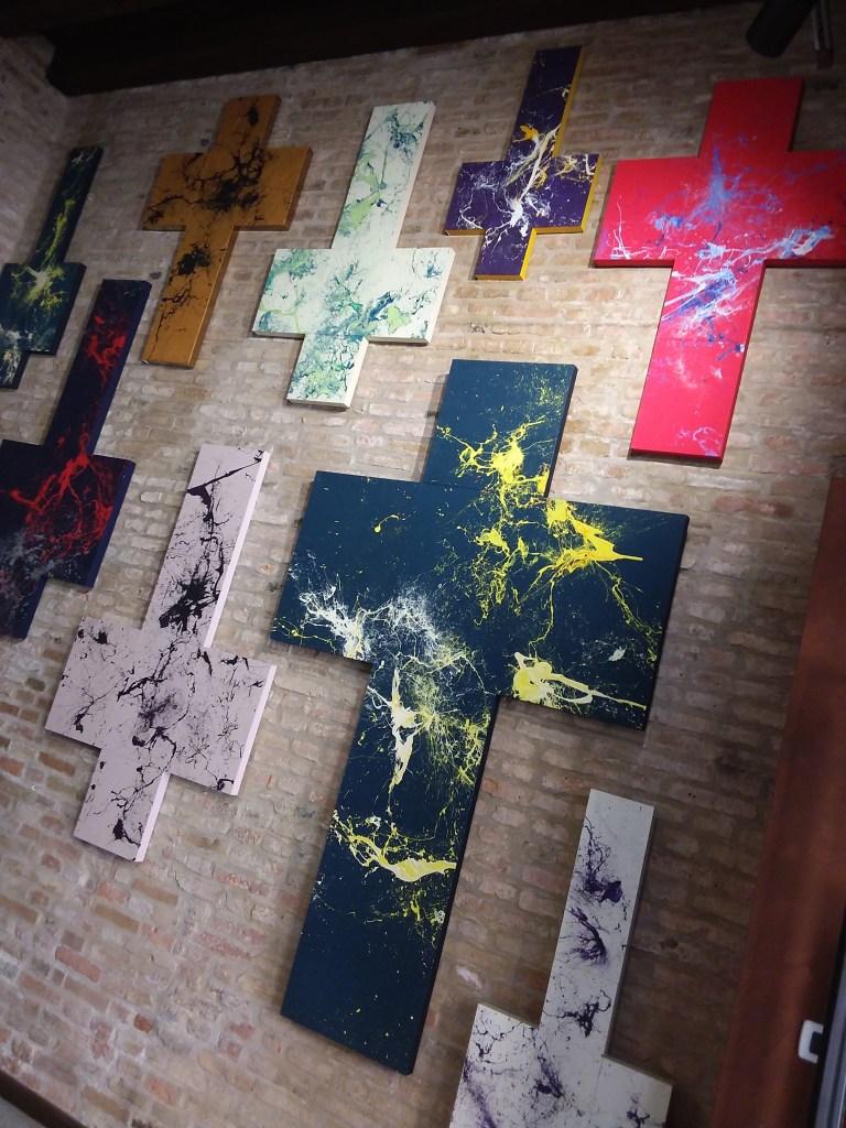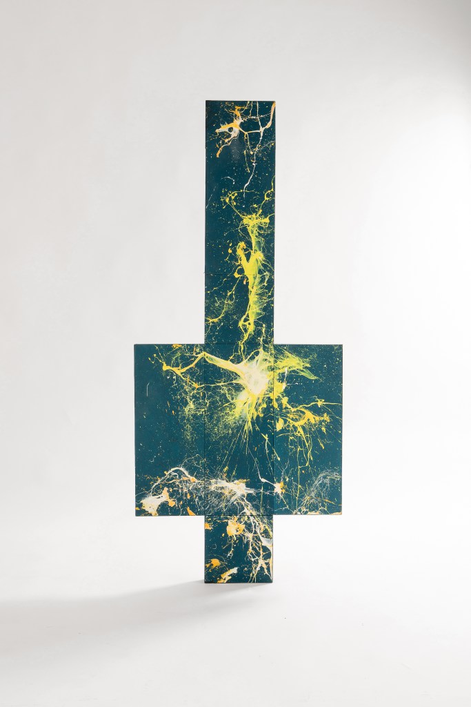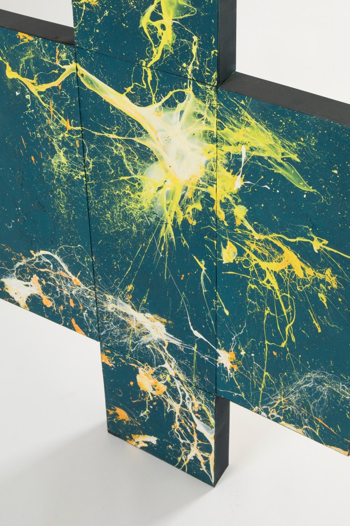 Il punto di partenza verso questo ciclo di opere è stata la voglia di colore e la necessità di ridurre al minimo l’intervento fisico, lasciando una traccia il più possibile anarchica e spontanea! Una sorta di mappa stellata, una costellazione di schizzi casuali.