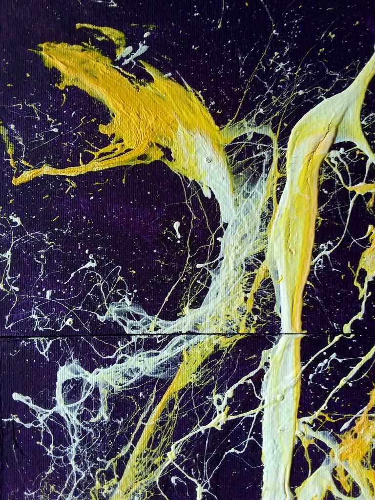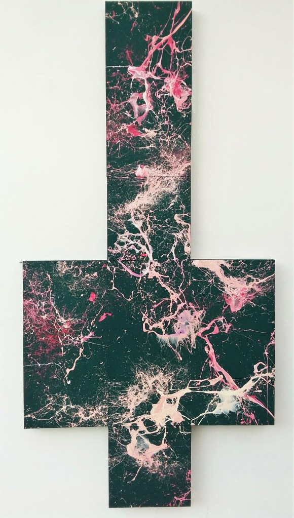Il punto di partenza verso questo ciclo di opere è stata la voglia di colore e la necessità di ridurre al minimo l’intervento fisico, lasciando una traccia il più possibile anarchica e spontanea! Una sorta di mappa stellata, una costellazione di schizzi casuali.