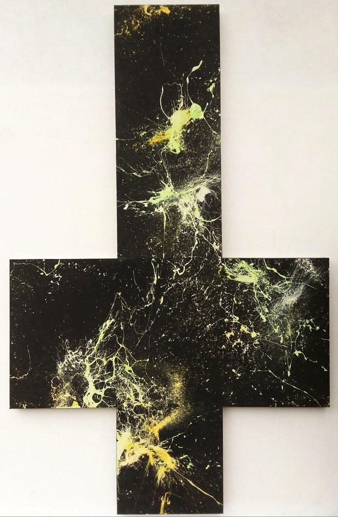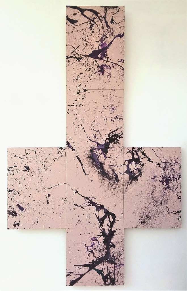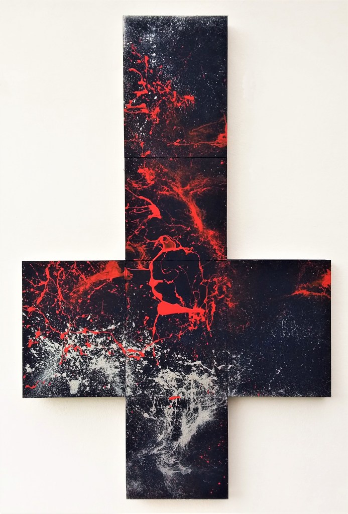 La dinamica della folle corsa del colore, che si strazia, separa, cerca di prevalere smembrandosi, polverizzandosi ci appare evidente in tutta la sua potenza. Rivelare il Big Bang generato nei BOX rende visibile ciò che visibile non è…“l’energia”. Risistemando le sei tele secondo una mia logica propongo un percorso segnico esibendolo sotto forma di croce. Ho trovato da subito un feeling particolare mentre realizzavo i primi Box.