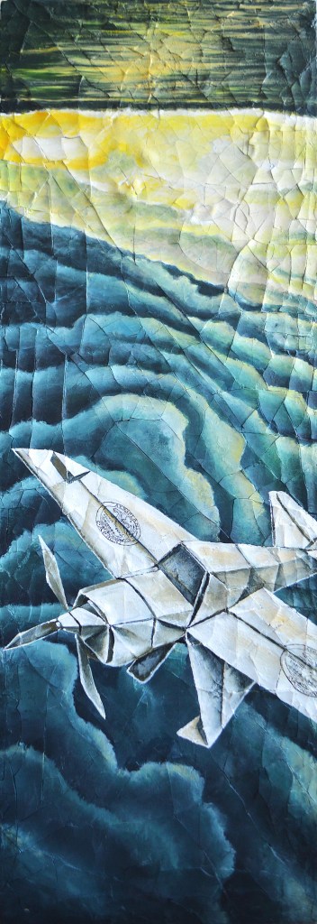 In this work, I highlight two fundamental aspects for realizing the projects we set for ourselves, even when they may seem improbable or even absurd — just as occurred in the history of aviation during its early days. The first aspect is perspective, the point from which we observe the world. A certain detachment from reality is needed to grasp the balance of things. Viewing the world upside down, even under a threatening sky, allows us to distinguish lines, shapes, volumes: new suggestions that the eye registers and transmits to the mind, opening up unexpected possibilities. The second aspect is audacity. The audacity to take flight with a simple paper airplane, facing unpredictable winds, losing altitude only to rise again, deviating from the course to discover new places to land and new projects to give birth to. The work measures 45 × 130 cm and is created using mixed media: acrylic paints, clay, and various materials in the year 2026.